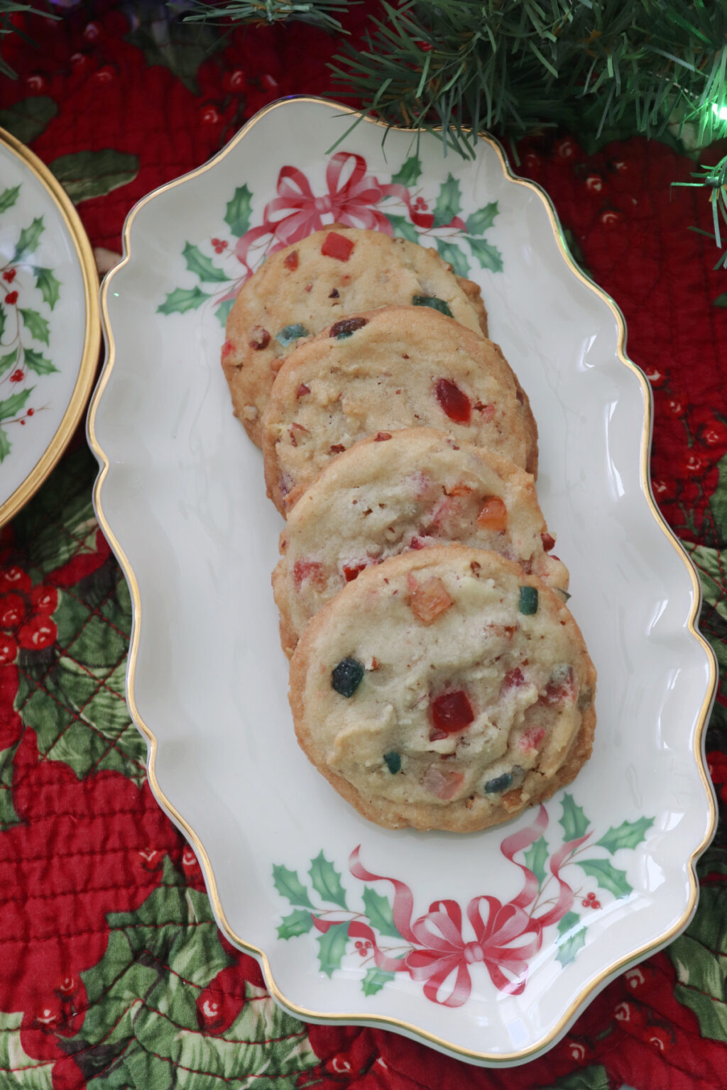 Need a quick holiday treat? These time-saving cookies capture the essence of fruitcake in a chewy, bite-sized format. Starting with refrigerated sugar cookie dough, they are effortlessly mixed with holiday candied fruit and chopped pecans.